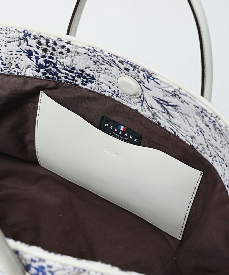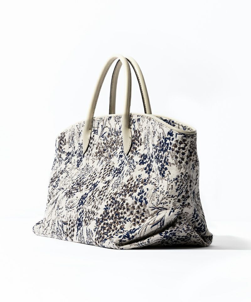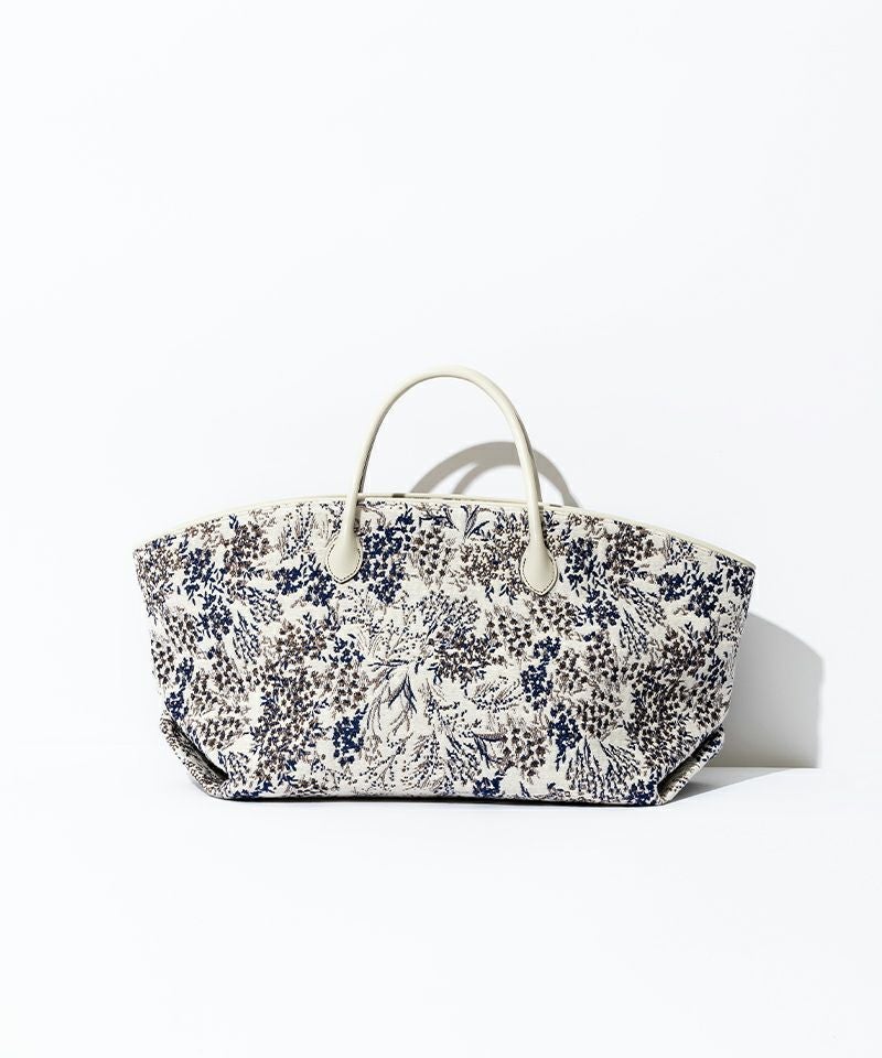 銀糸を織り込み、繊細な小花柄を表現した“GARDEN”シリーズは、エディター・白澤貴子さんの審美眼によって選ばれたスペシャルなコレクションです。大胆な横長フォルムのマルシェバッグ。