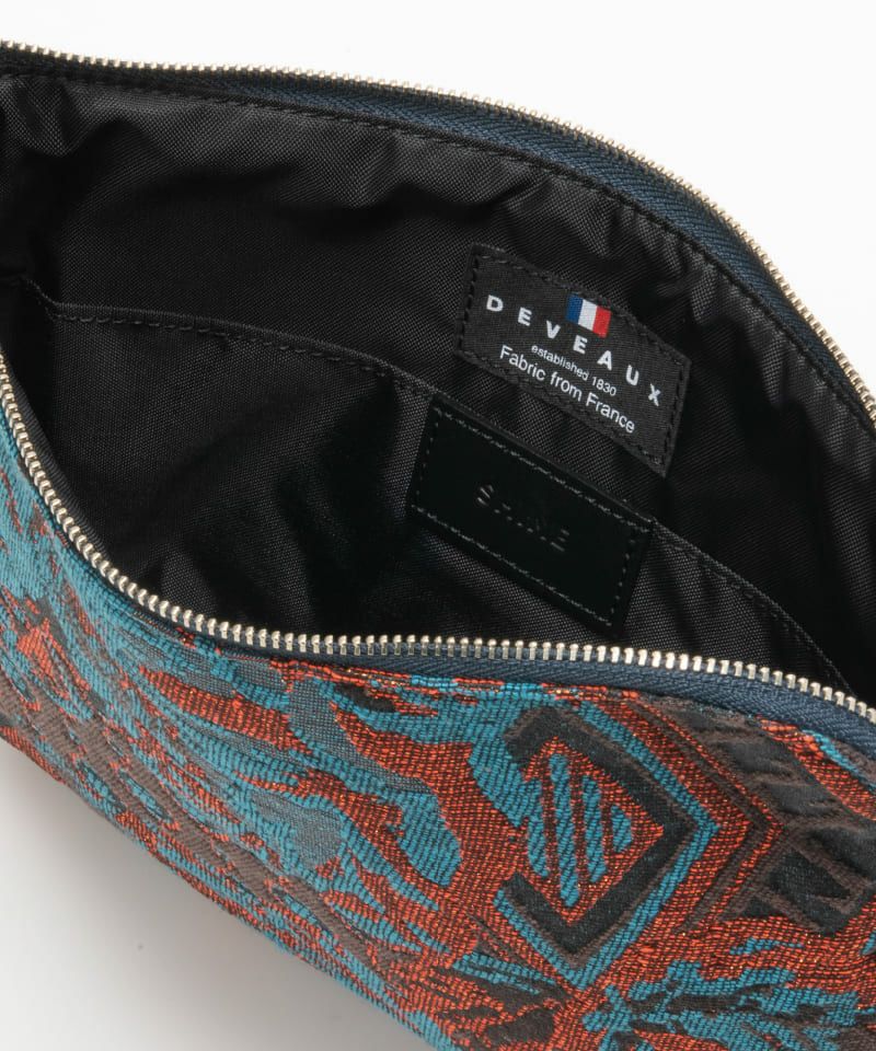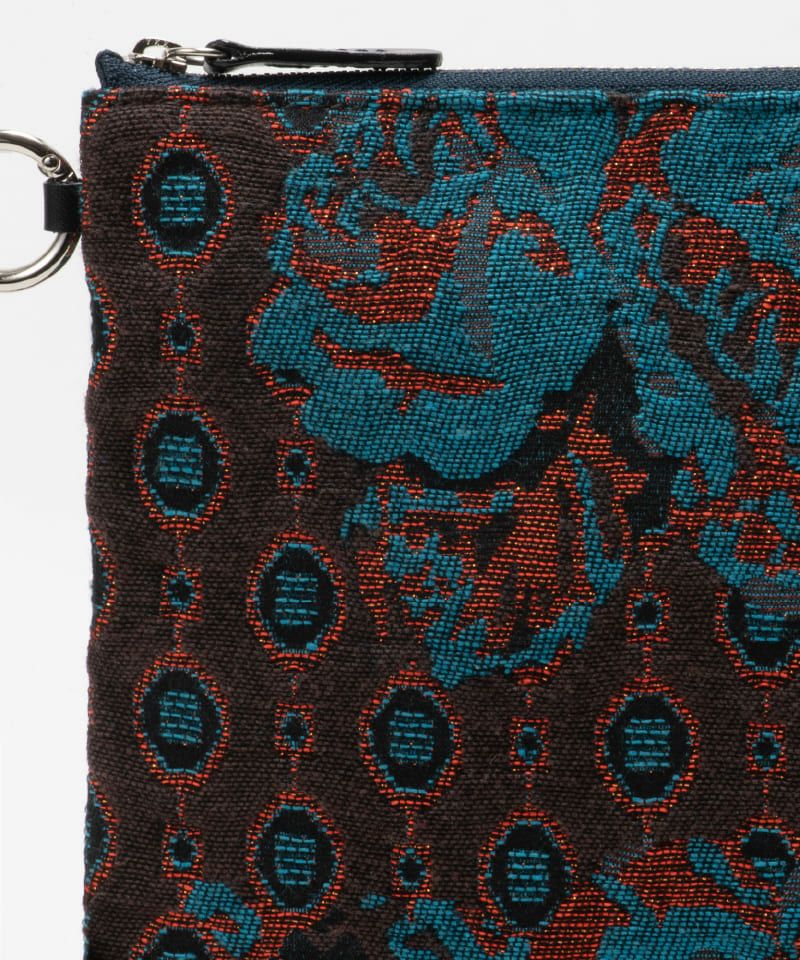 ジャカード(Deveaux/デヴォー社製)の存在感を生かしたミニポーチが仲間入り。MサイズはiPad miniが収納可能なB5サイズで、内側に仕切りがありメモ帳やペンも収納できマルチに活躍します。うすマチなのでバッグの中でもかさばらず、ミニサイズのお財布やハンカチなども入りミニクラッチとしてもお使いいただけます。カラビナ金具付きで手持ちのストラップをつけて使用することもでき、生地にも裏加工を施しているのでしっかりした厚みで高級感があります。