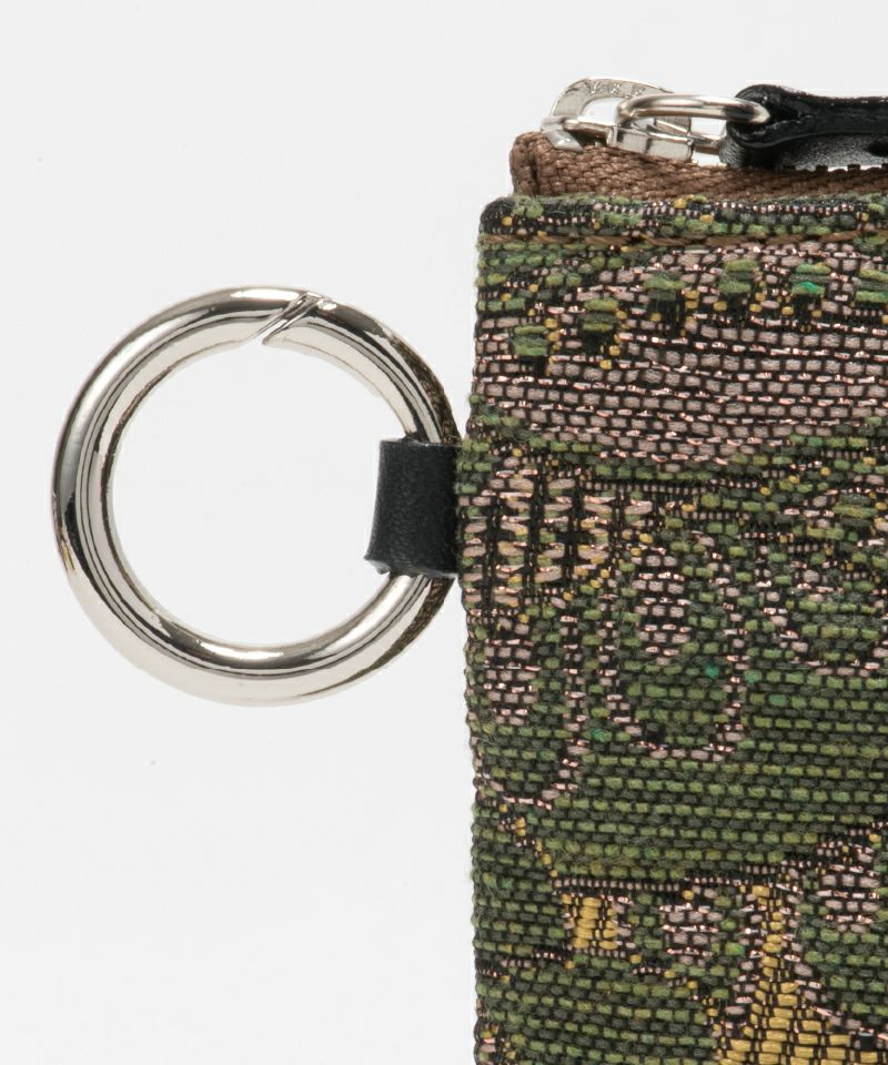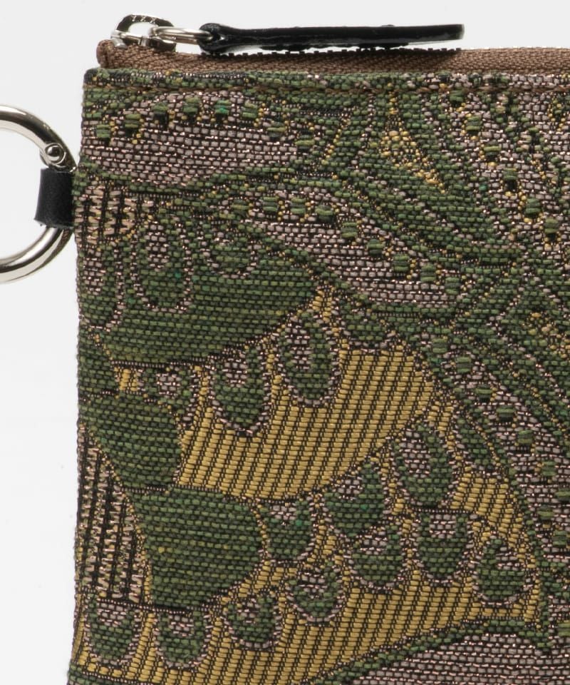 ジャカード(Deveaux/デヴォー社製)の存在感を生かしたミニポーチが仲間入り。ハンドクリームやリップなど日常の小物入れとしてお使いいただけて、うすマチなのでバッグの中でもかさばりません。カラビナ金具付きで手持ちのストラップをつけて使用することもでき、生地にも裏加工を施しているのでしっかりした厚みで高級感があります。