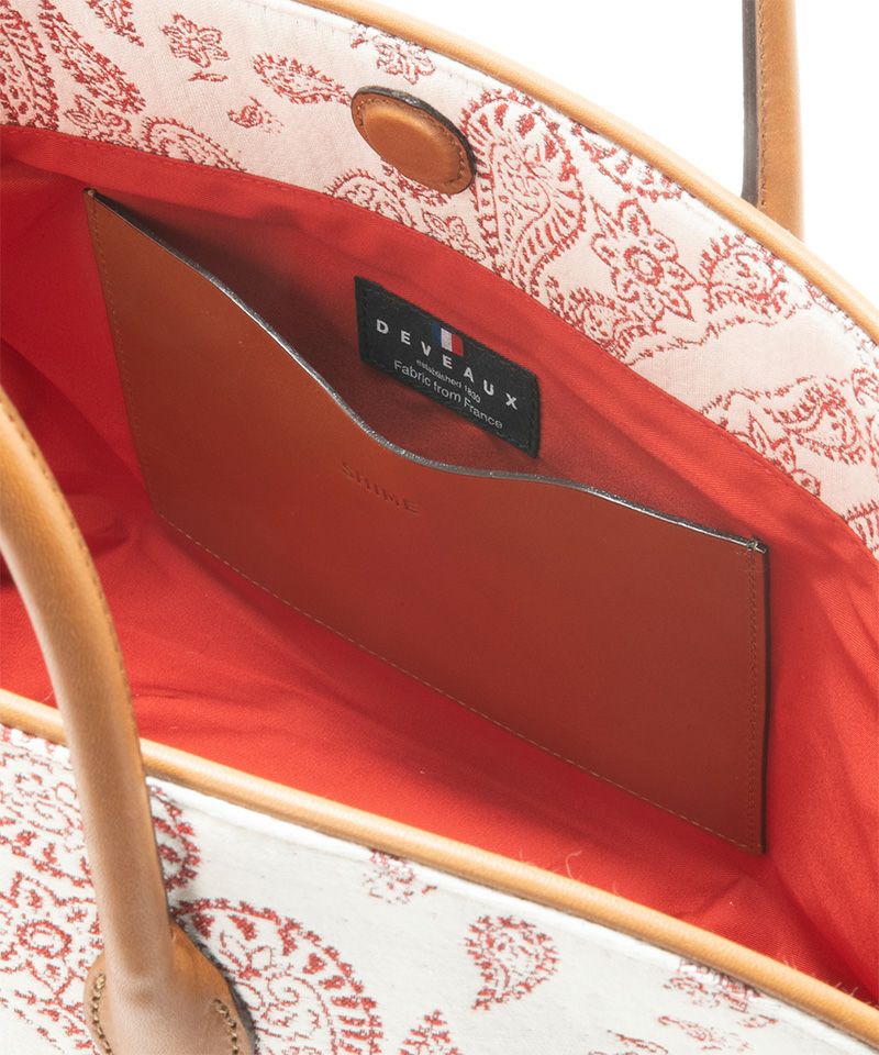 ハンドステッチをあしらったような淡いトーンのペイズリー柄が印象的な”VOYAGE”。バッグを開けたときにアイキャッチとなるインナーカラーもペイズリーのカラーと同色のレッドに。
